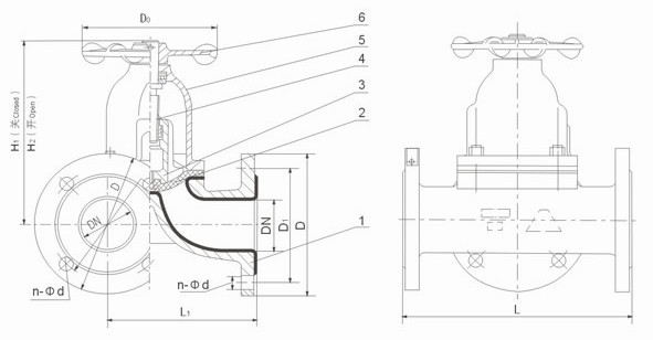 4. 閥體與蓋被中間隔膜隔開,使得隔膜上方的閥蓋,閥桿等零件不受介質(zhì)侵蝕;