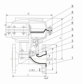 4. 閥體與蓋被中間隔膜隔開,使得隔膜上方的閥蓋,閥桿等零件不受介質(zhì)侵蝕;