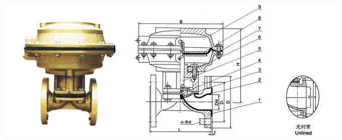 部件列表:1.閥體 2.閥體襯里 3.隔膜 4.閥瓣 5.下閥桿 6.閥蓋 7.氣缸 8.氣動(dòng)薄膜 9. 氣缸蓋