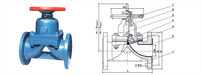 1.閥體 2.閥體襯里 3.隔膜 4.閥瓣 5.閥桿 6.閥蓋 7.手輪