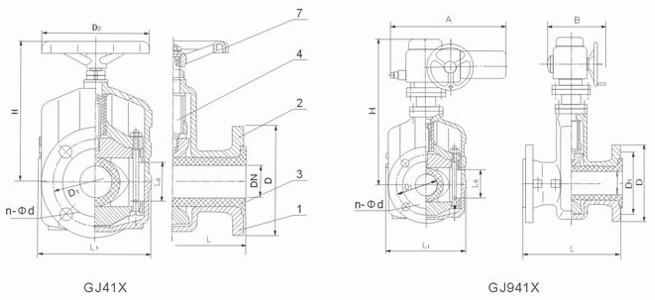 (1)結(jié)構(gòu):本閥門由左右閥體,橡膠管套、大小閥桿、上下閘板、導(dǎo)柱等零件組成。