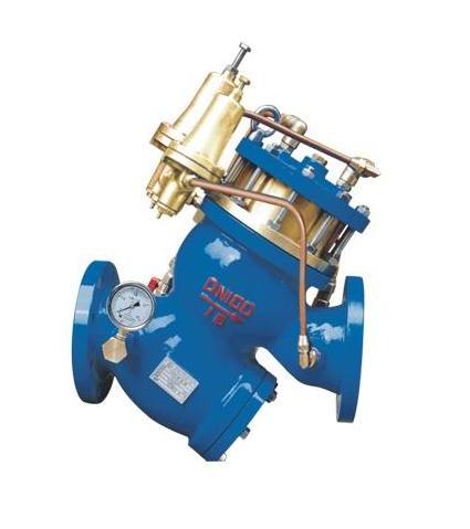 該多用閥由一個(gè)Y型寬閥腔帶過濾器的主閥、一個(gè)三通式低壓導(dǎo)閥各一個(gè)三通式高壓導(dǎo)閥組成,當(dāng)意外斷電、水泵關(guān)機(jī)、水泵啟動(dòng)等情況時(shí),產(chǎn)生一個(gè)低壓波動(dòng),這時(shí)低壓導(dǎo)閥開啟與大氣相通,活塞上腔壓力下降,主閥開啟泄水,并在回水高壓到來時(shí),保持找開狀態(tài),當(dāng)管網(wǎng)壓力增至工況壓力時(shí),低壓導(dǎo)閥和主閥都緩慢關(guān)閉。